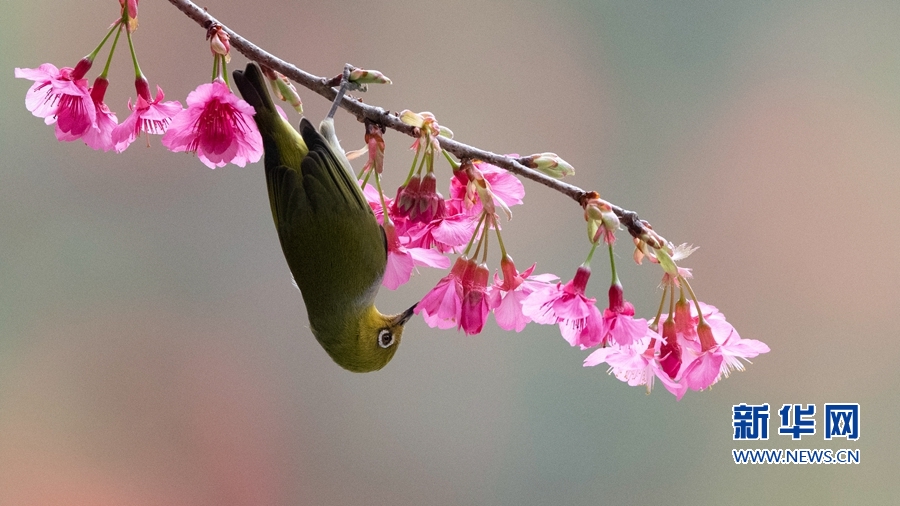 1月26日,福建省福州市金鸡山公园内,一只暗绿绣眼在盛开的樱花枝头采蜜。新华社记者 梅永存 摄