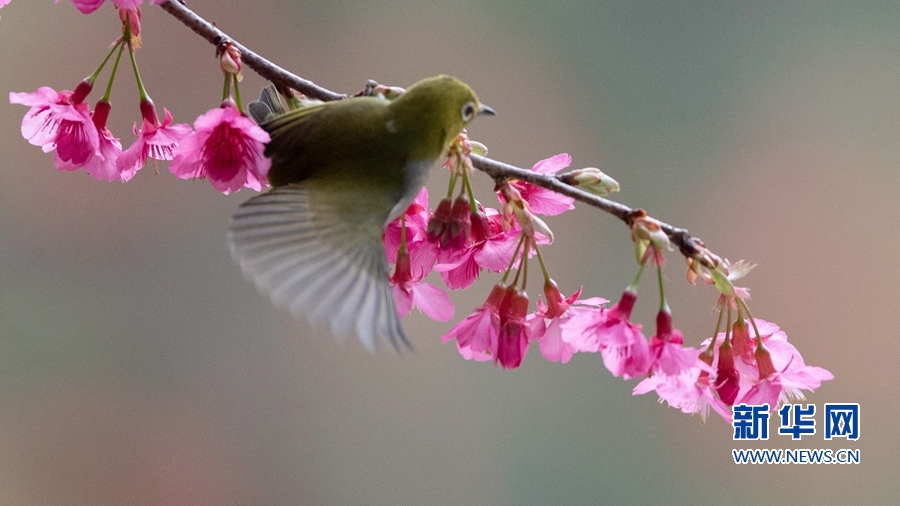 1月26日,福建省福州市金鸡山公园内,一只暗绿绣眼在盛开的樱花枝头采蜜。新华社记者 梅永存 摄