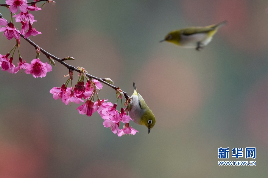 1月26日,福建省福州市金鸡山公园内,一只暗绿绣眼在盛开的樱花枝头采蜜。新华社记者 梅永存 摄