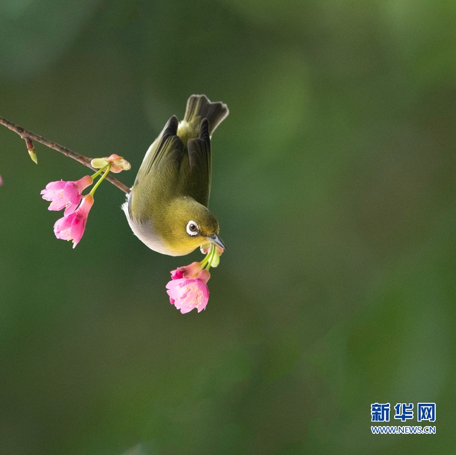 1月26日,福建省福州市金鸡山公园内,一只暗绿绣眼在盛开的樱花枝头采蜜。新华社记者 梅永存 摄