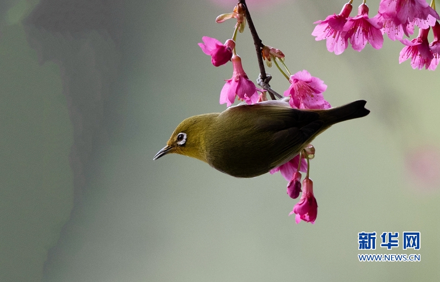 1月26日,福建省福州市金鸡山公园内,一只暗绿绣眼在盛开的樱花枝头采蜜。新华社记者 梅永存 摄