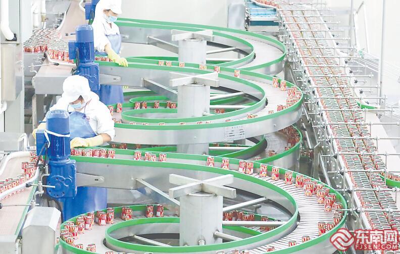 7日,在位于石狮市大堡工业区的华宝明祥食品有限公司智能生产线上,员工正加紧生产出口泰国的鱼罐头。