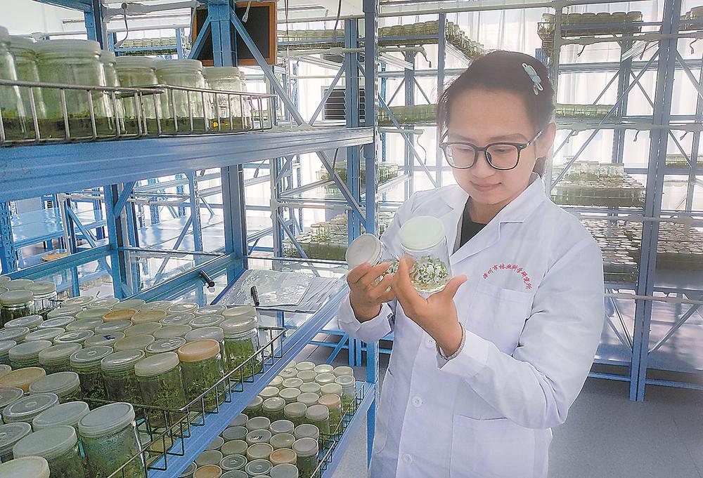 漳州市林业科学研究所工作人员察看托里桉组培苗生长情况。(资料图片)
