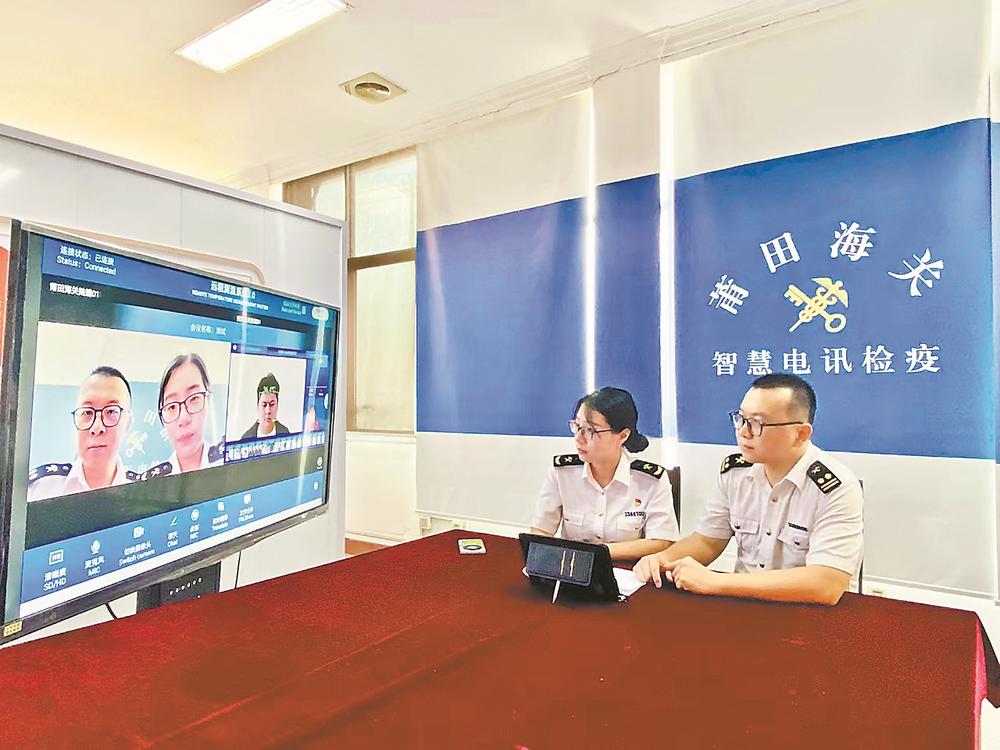 福州海关所属莆田海关系全国首批运用智慧电讯检疫模式的基层海关之一。该模式引入“便携式远程测温流调仪”“头戴式智能监控仪”“移动作业终端”等智能化远程监管设备,通过口岸5G通信AI辅助识图等手段,海关关员在办公室即可远程完成船员体温监测、流行病学调查、船舶卫生监督及后续检疫监管工作,无需现场登临检疫,极大节约企业时间成本,有效提升口岸通关效率。