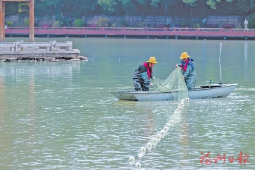昨日上午,在西湖芳沁园河及入湖口区域,一场攻坚全面展开,几名施工人员密切配合,鱼群随即“入网”。