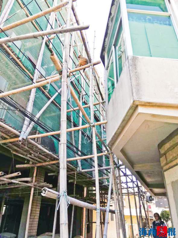 “大圣”爬到近5米高的木架上。市民陈女士摄