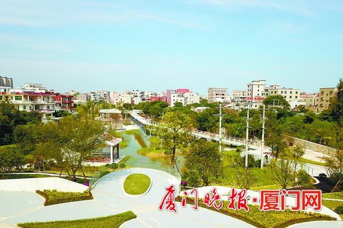 记者看到,公园整体呈狭长状,园内有一条水系贯穿其中。据项目代建单位厦门澳头建设发展有限公司副总经理张坚介绍,这条生态水系原本只是一处下凹的地形,以前村民的生活污水无序排放到这里,形成一个臭水塘,蚊虫滋生。代建单位结合实际,在原有下凹地形的基础上进行改造,使这里已成为公园内的一道水系景观。