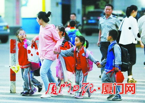 昨日傍晚气温回落,几名身穿秋冬装校服的孩子走在放学回家的路上。(记者 张奇辉 摄)