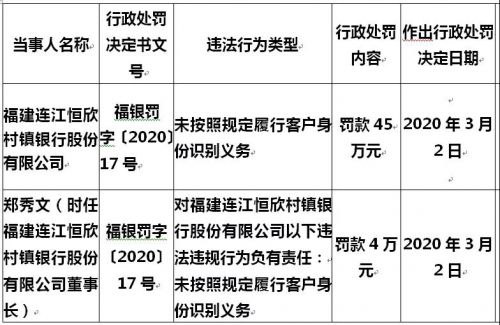 今日,中国人民银行福州中心支行在官网上公示了一批行政处罚信息,省内多家银行、金融机构因未按照规定履行客户身份识别义务、未按规定报送大额交易报告等行为,被处罚款,具体处罚情况如下——