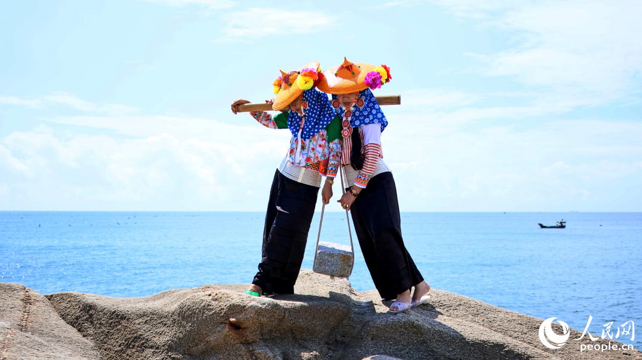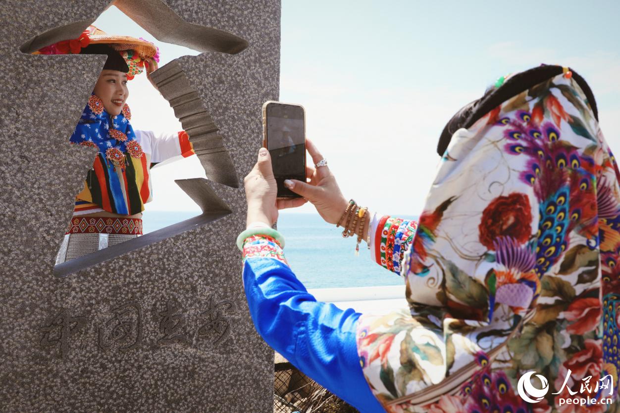 游客身着惠女服饰在海边“打卡”。人民网 李唯一摄