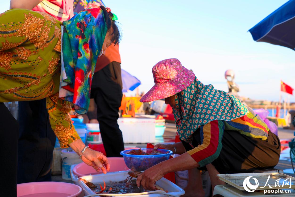 渔港边惠女们正在出售海货。人民网 李唯一摄