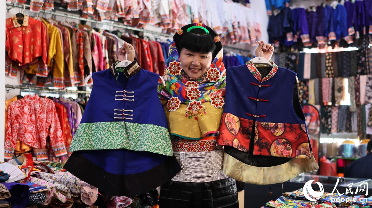 惠安女服饰非物质文化遗产传承人曾茹婷展示改良前后的“贴背”。人民网 李昌乾摄