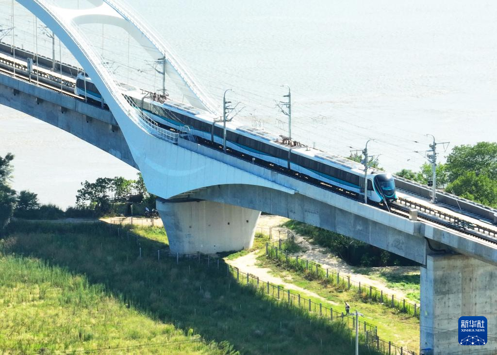 9月29日,列车驶入滨海快线帝封江站(无人机照片)。新华社记者 林善传 摄