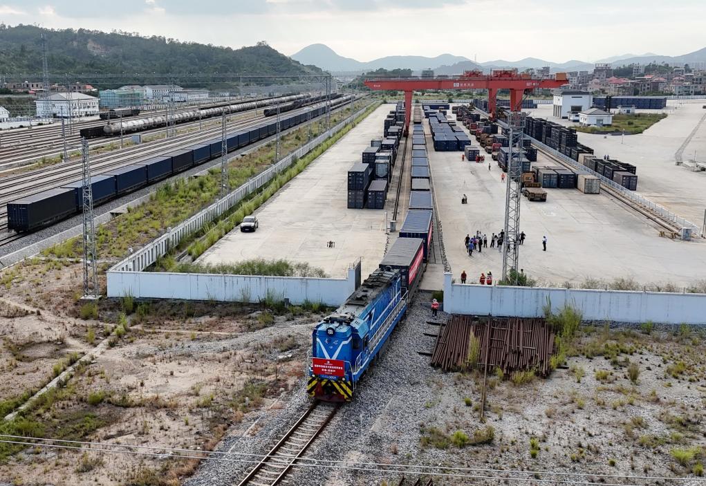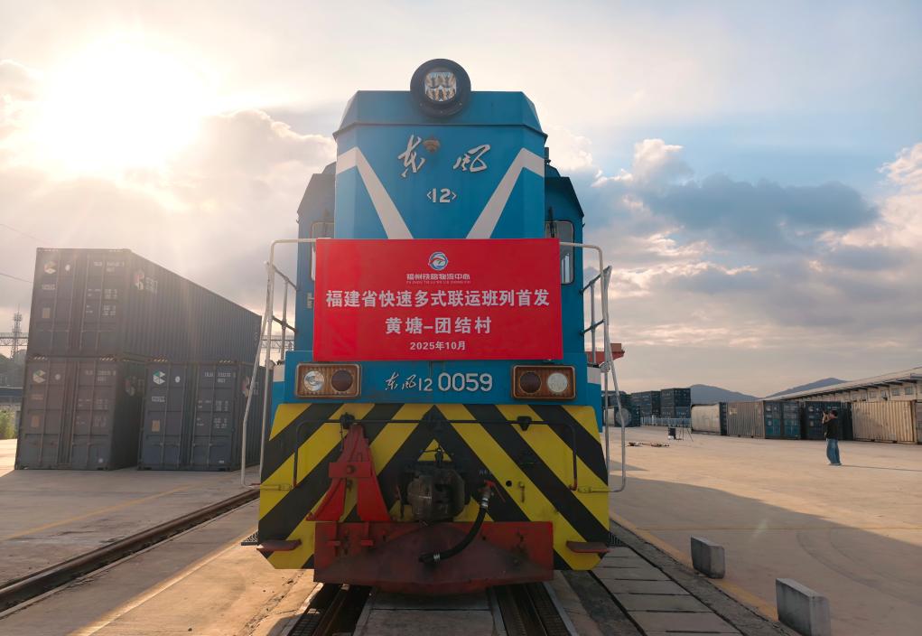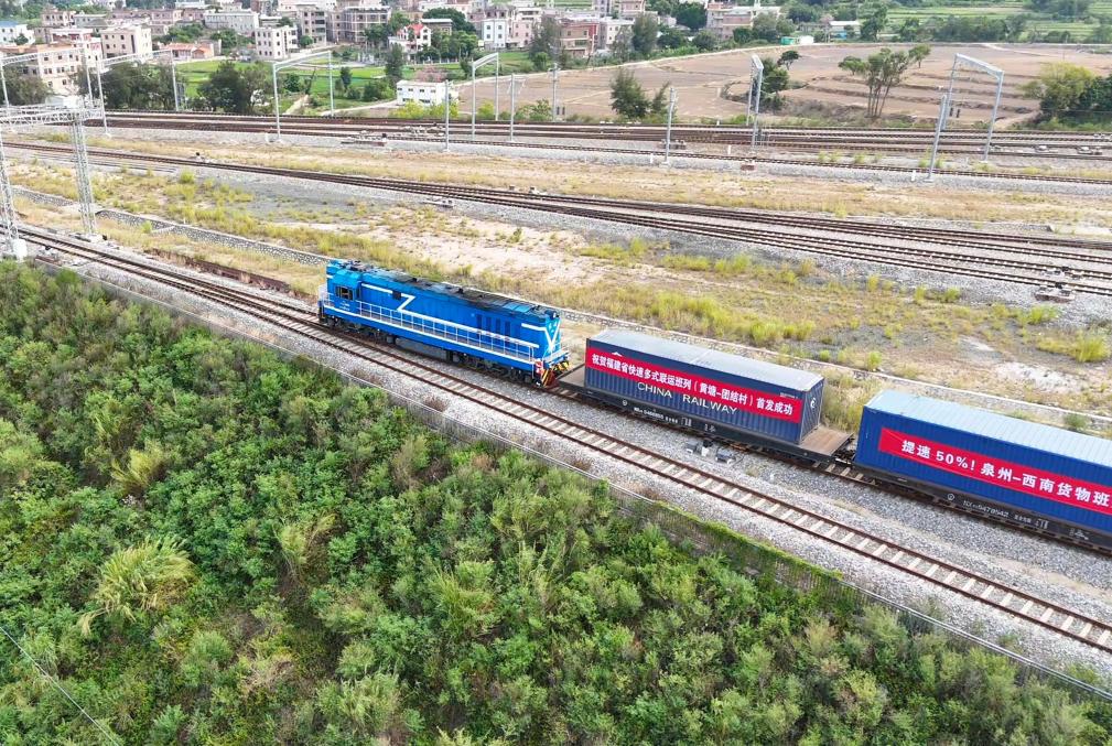 10月10日,一列装载25个集装箱轻工产品的X8666次快速多式联运班列从福建省泉州市黄塘铁路货场驶出,以最高120公里时速开往重庆团结村站。这标志着福建省首列快速多式联运班列正式开行。新华社发