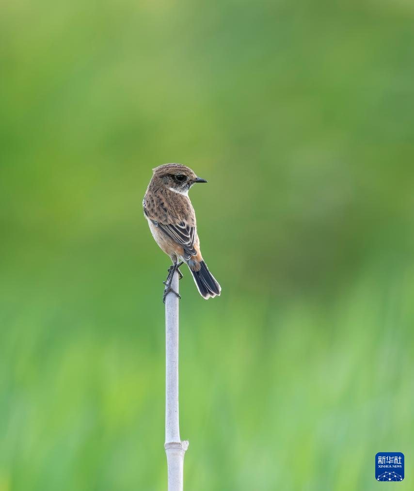 在福州白沙镇孔元村,一只黑喉石䳭在杆头停留(10月7日摄)。新华社记者 魏培全 摄