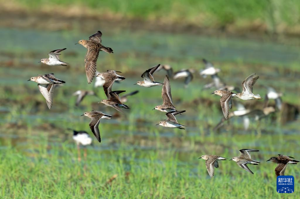 一只黄胸滨鹬(左三)和水鸟在位于福建泉港与惠安辋川交界的农田的上空飞过(9月9日摄)。新华社记者 魏培全 摄