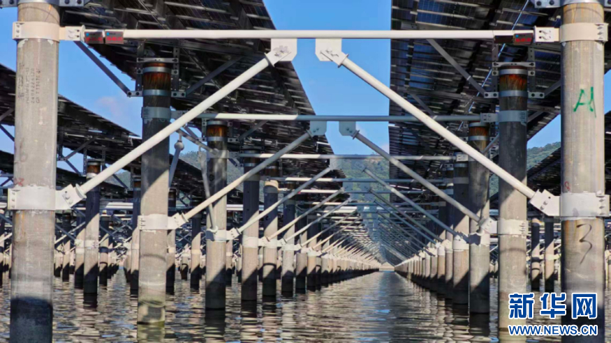 三峡集团东山杏陈180兆瓦海上光伏电站应用了国内首创的“多桩+斜撑”结构,同时创新应用抗台型支架。新华网 刘默涵 摄