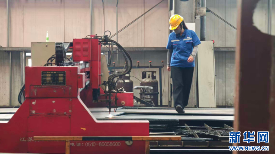 金风科技福清总装厂生产车间里,一名工作人员正在忙碌。新华网 刘默涵 摄