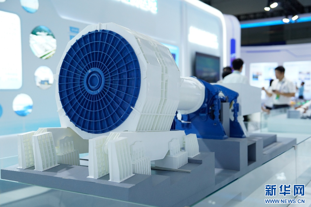 图为现场展示的25MW海上风电机组全尺寸地面试验平台模型。新华网 蒋巧玲 摄