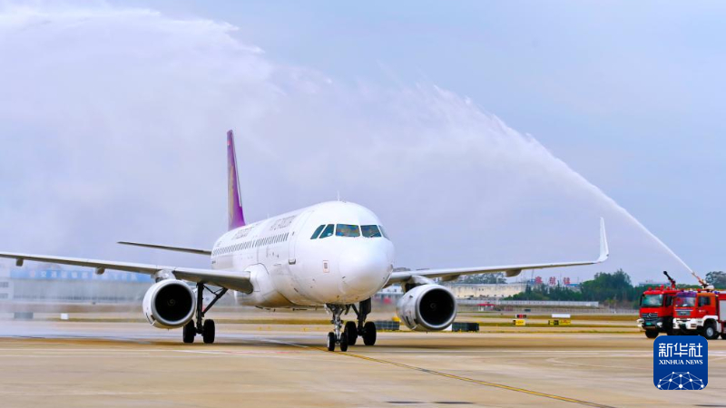 10月26日,从金边飞来的柬埔寨国家航空的客机抵达福州长乐国际机场时举行过“水门”仪式。新华社记者 林善传 摄