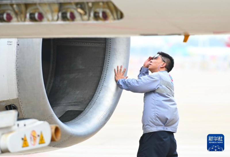 10月26日,在福州长乐国际机场,工作人员在检查飞机安全情况。新华社记者 林善传 摄