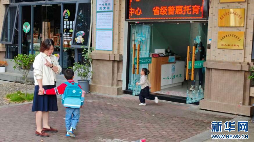 一心莲庄托育园园长夏碧玲在校园门口迎接孩子(2025年10月31日摄)。新华网 刘默涵 摄