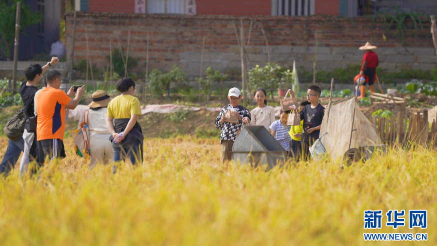 不少家长趁着周末带着孩子前来体验水稻收割。新华网发(林楷煜 摄)