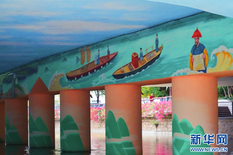 晋安河—光明港航线上的桥梁彩绘“水上朝贡”。新华网发(福州市水务文化旅游有限公司供图)