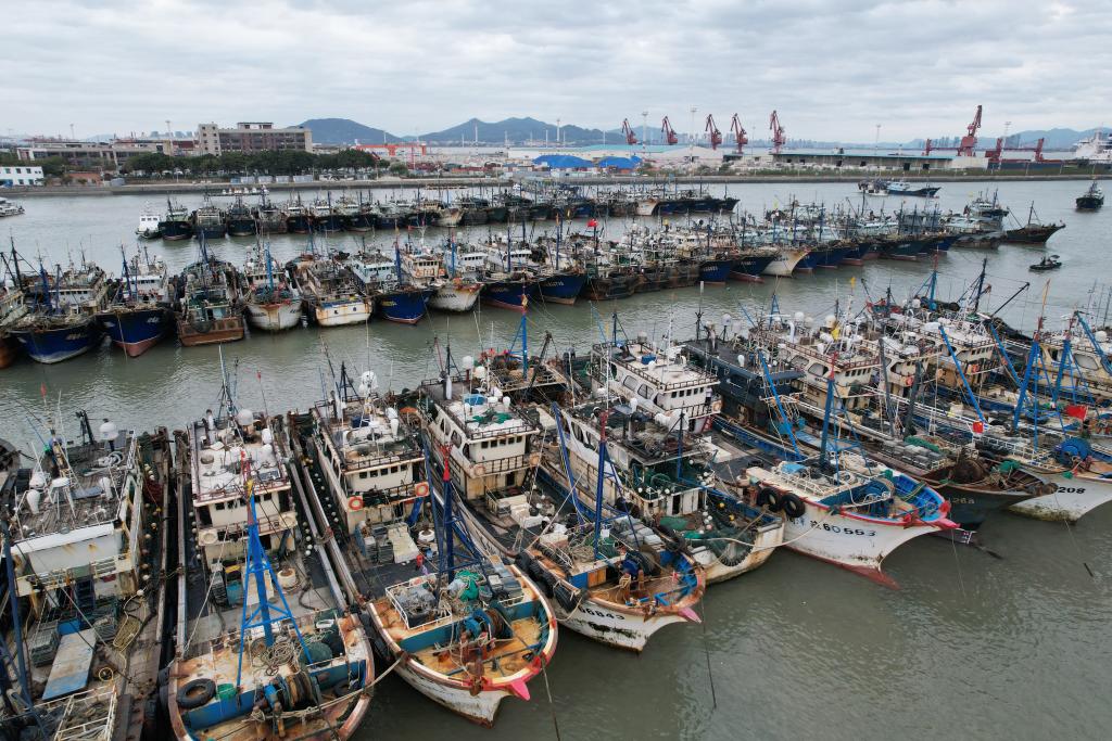 11月10日,大批渔船停靠在福建厦门高崎闽台中心渔港躲避台风(无人机照片)。