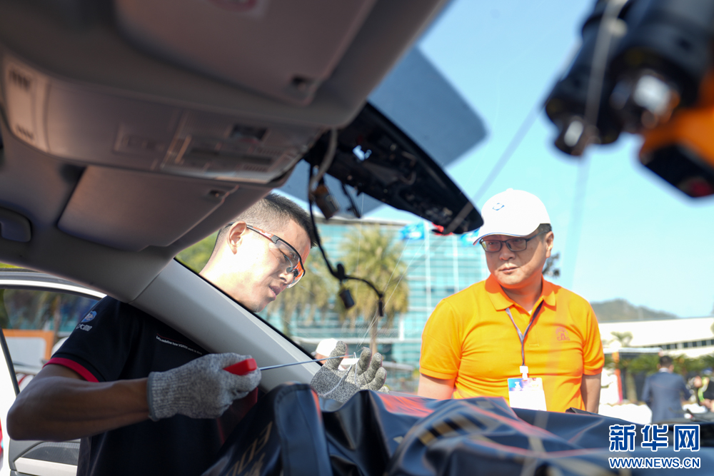 11月28日,汽车玻璃安装技能项目决赛现场,选手对安装好的玻璃进行检查。新华网 肖和勇 摄