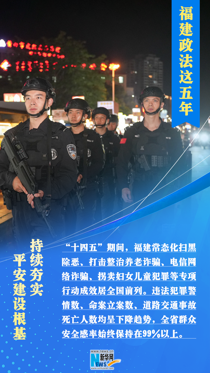 新华网福州12月6日电(蒋巧玲 连雨欣)“十四五”期间,福建政法系统全力以赴做好防风险、保安全、护稳定、促发展工作,法治化营商环境进一步优化,国家安全东南屏障进一步巩固,政法改革和队伍建设进一步加强。5日,福建省委宣传部召开“在中国式现代化建设中奋勇争先 奋力谱写新征程新福建建设新篇章”系列主题新闻发布会(第二场),介绍并发布福建政法工作成效。