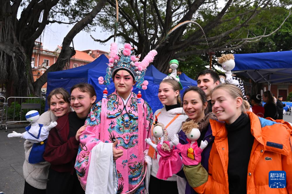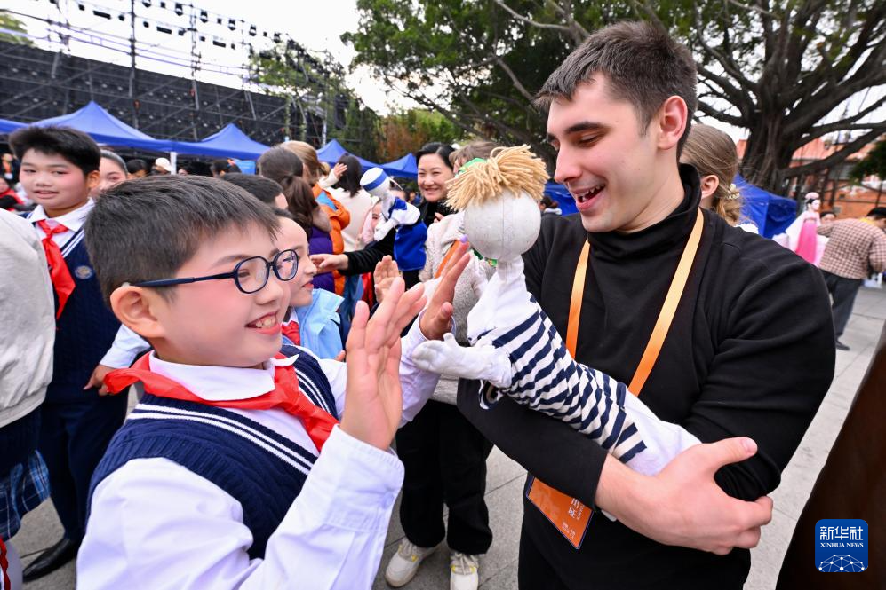 12月12日,参加泉州国际木偶展演活动的俄罗斯青年与小朋友互动。新华社记者 姜克红 摄