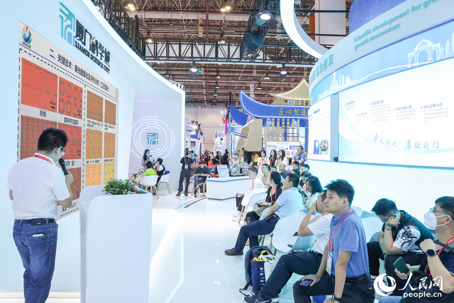 在厦门科学城展区,工作人员向嘉宾们认真推介。人民网记者 陈永整摄