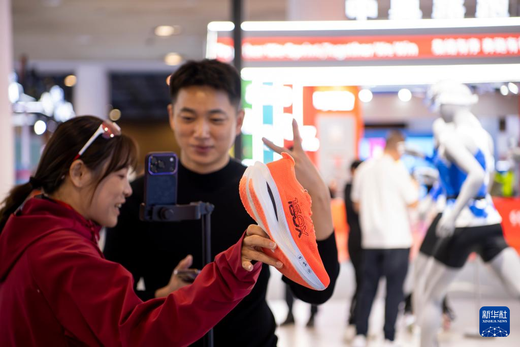 1月8日,两名体育用品企业工作人员在博览会现场利用电商平台直播推销运动鞋。新华社记者 魏培全 摄