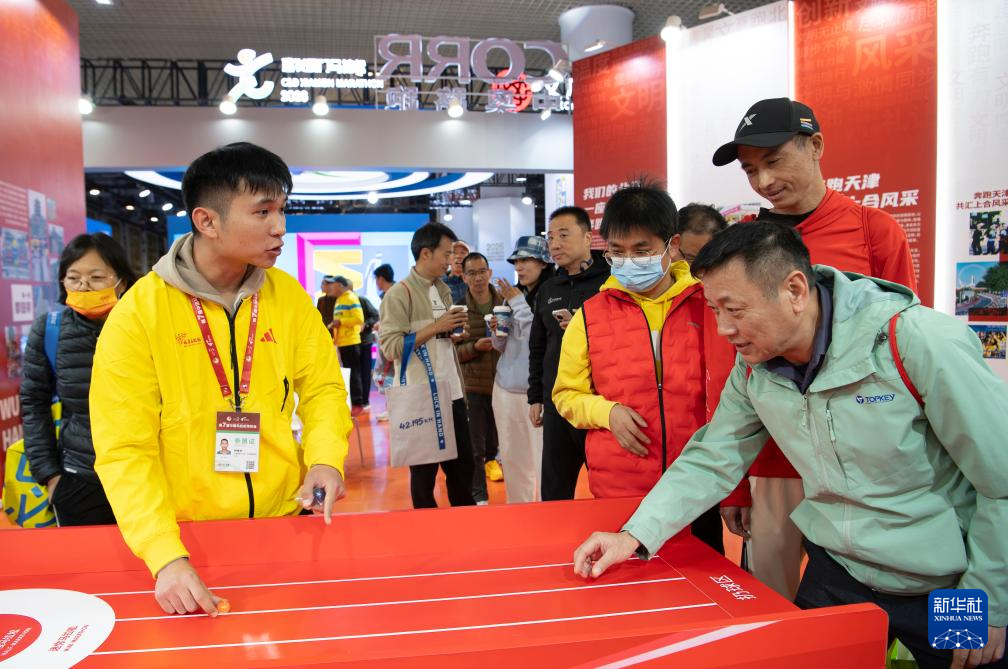 1月8日,厦门马拉松赛选手在博览会现场参加互动游戏。新华社记者 魏培全 摄