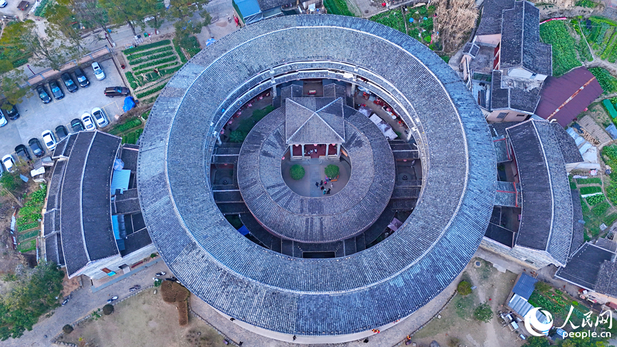 航拍视角下的振成楼采用了西洋建筑的装饰元素,是中西合璧的客家传统民居建筑杰作。人民网记者 李昌乾摄