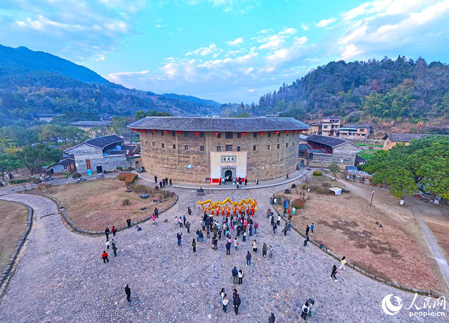 位于福建省龙岩市永定区的振成楼,游客围观舞龙表演,古楼间洋溢着浓浓年味。人民网记者 李昌乾摄