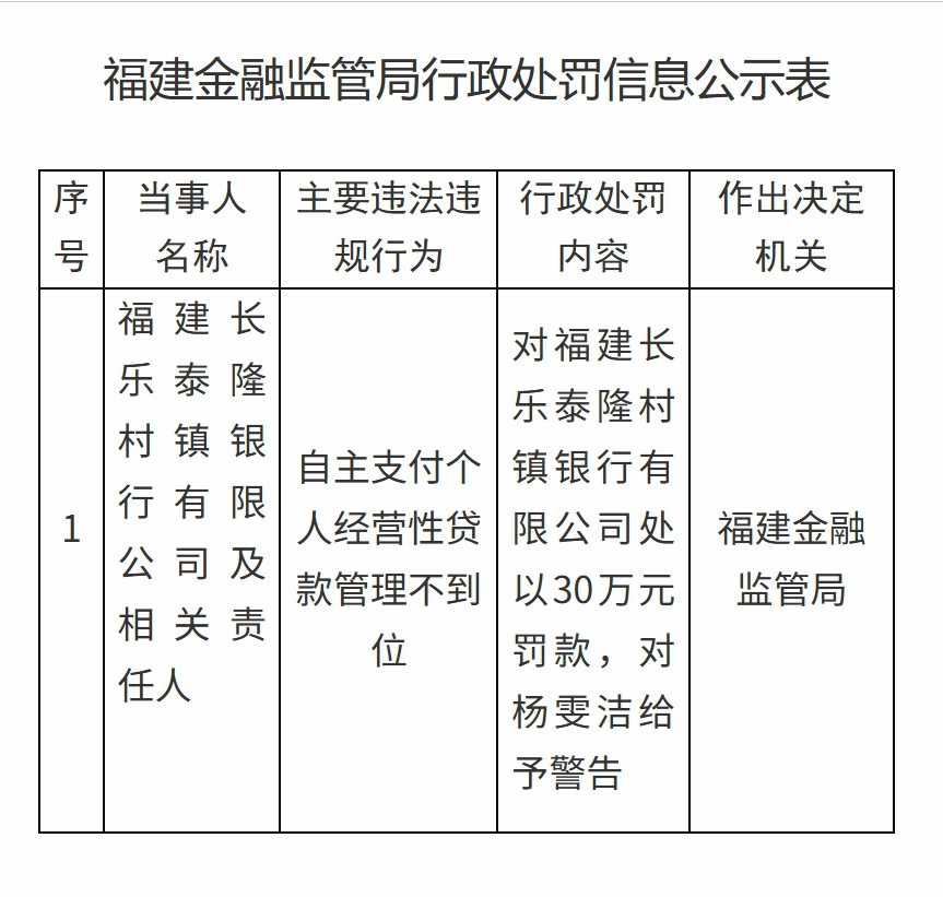 近日,国家金融监督管理总局福建监管局发布行政处罚信息公示表显示,因自主支付个人经营性贷款管理不到位,福建长乐泰隆村镇银行被罚30万元,相关责任人杨雯洁被给予警告。