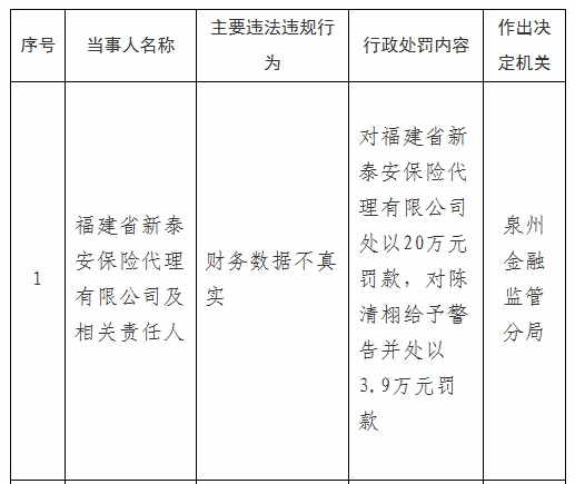 近日,国家金融监督管理总局福建监管局发布行政处罚信息,因财务数据不真实,泉州金融监管分局对福建省新泰安保险代理有限公司处以20万元罚款,对陈清栩给予警告并处以3.9万元罚款。