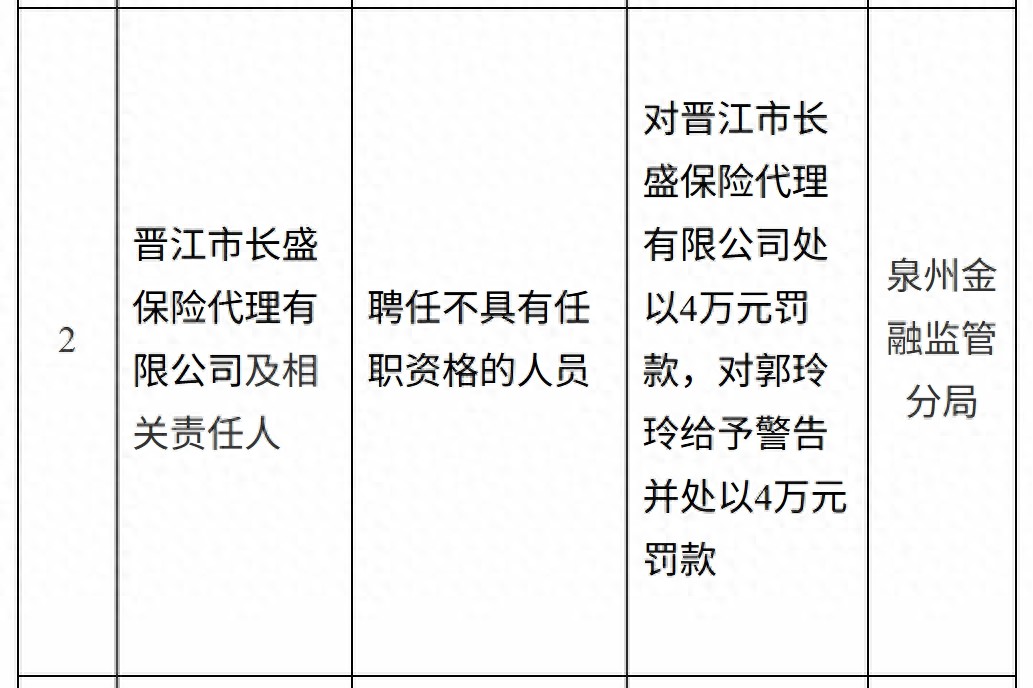 近日,国家金融监督管理总局福建监管局发布行政处罚信息,因聘任不具有任职资格的人员,泉州金融监管分局对晋江市长盛保险代理有限公司处以4万元罚款,对郭玲玲给予警告并处以4万元罚款。
