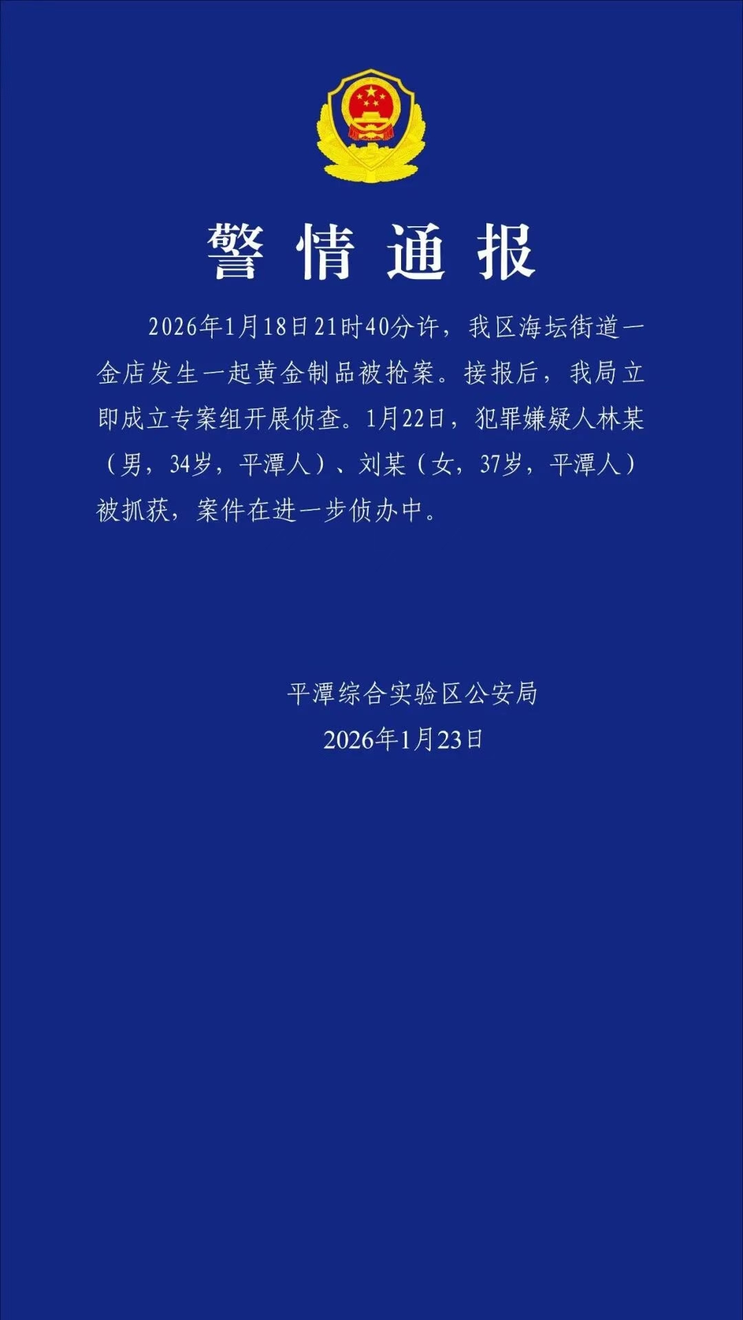 1月23日,平潭综合实验区公安局发布通报:2026年1月18日,该区发生一起黄金制品被抢劫案,详情如下: