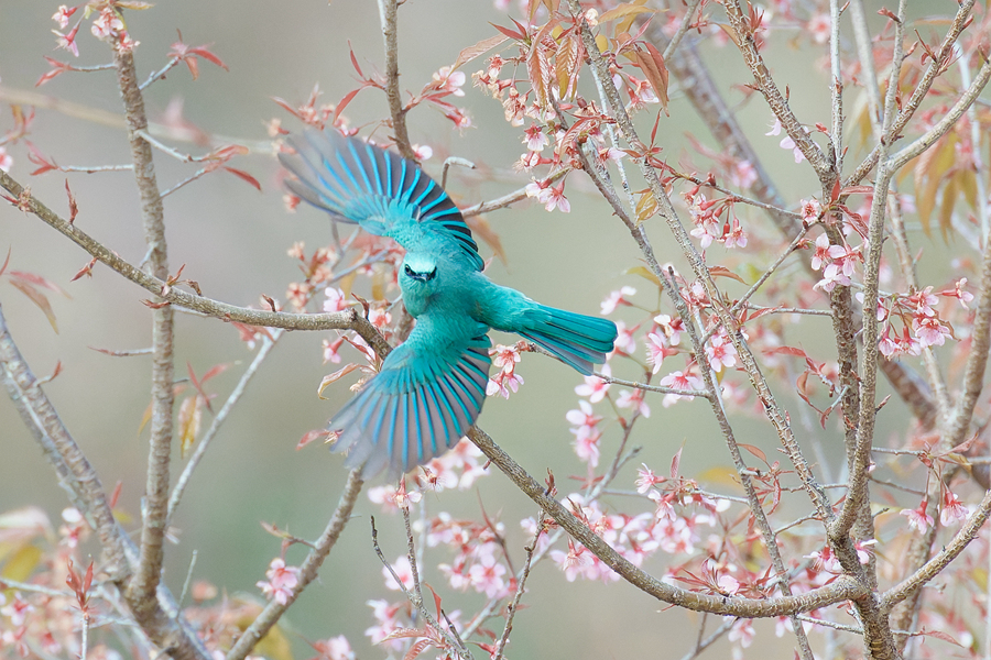 铜蓝鹟在樱花树枝头飞行穿梭。乐伟麟摄