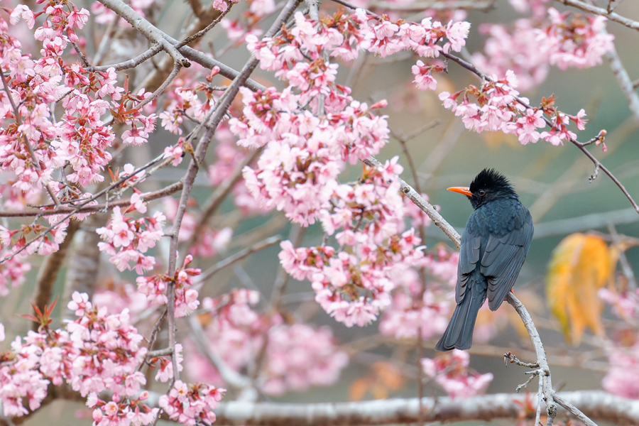 黑短脚鹎在樱花树冠上远眺。乐伟麟摄