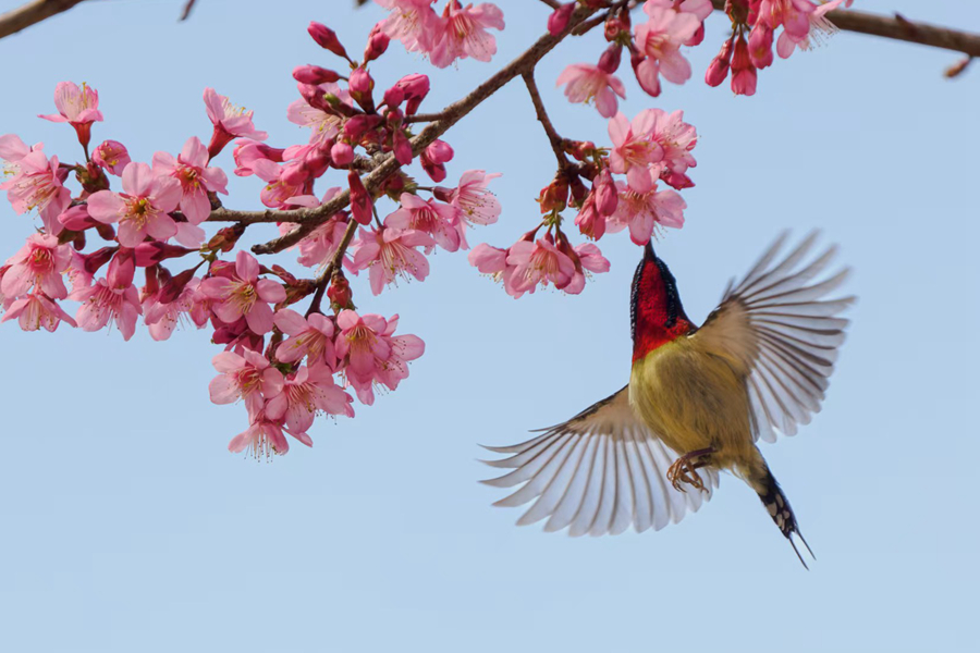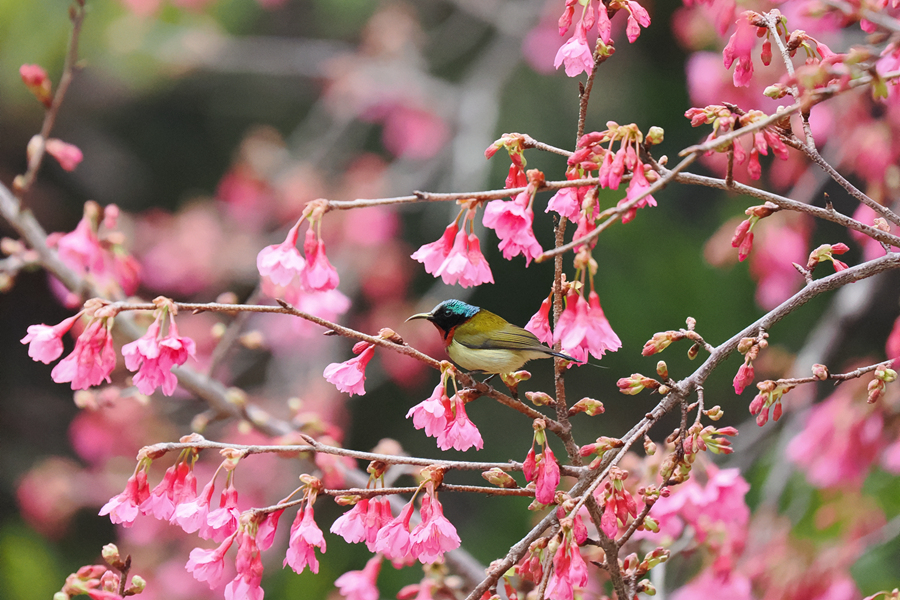 叉尾太阳鸟靓丽的羽毛与樱花相互映衬。陈俏伊摄