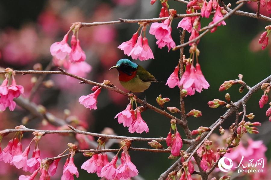 叉尾太阳鸟在樱花枝头小憩。人民网记者 陈博摄