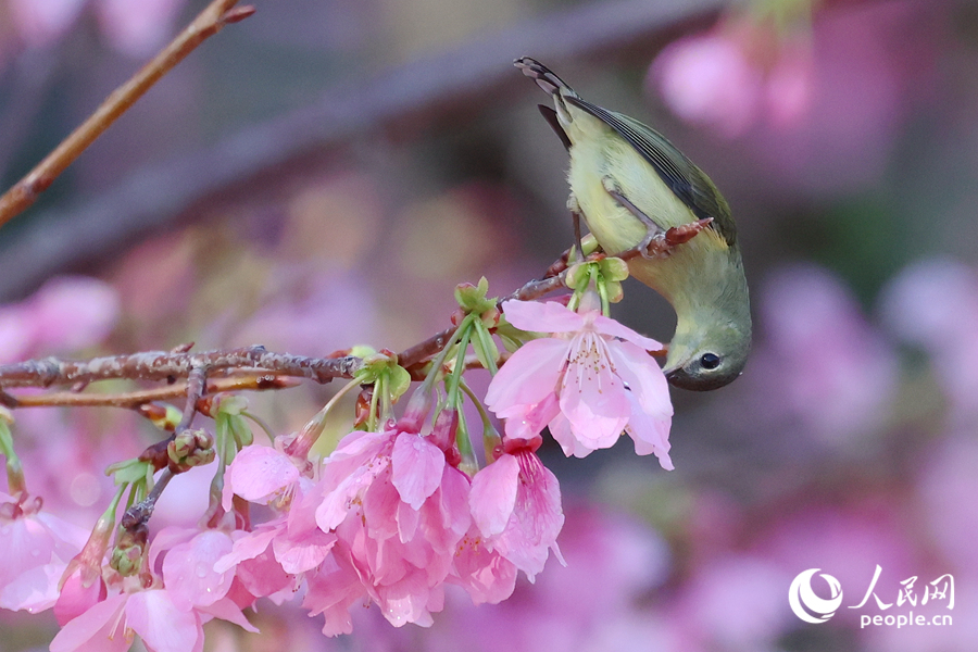 暗绿绣眼鸟在樱花枝头停留。人民网记者 陈博摄