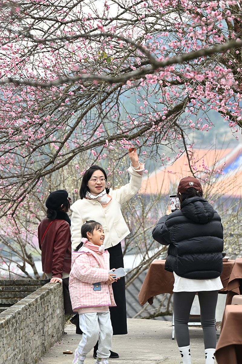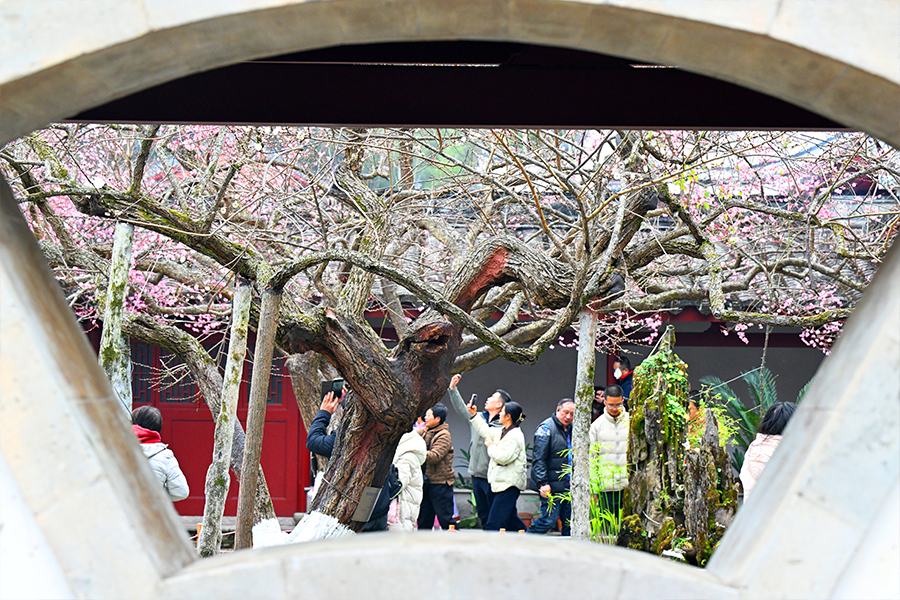 低垂的梅枝与朱红墙面构成经典景致,成为游客打卡首选。新华网发(叶诚 摄)