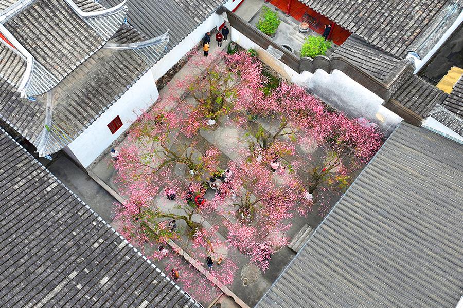 梅园里,300年树龄的红白古梅枝桠遒劲,花瓣缀满枝头。新华网发(叶诚 摄)