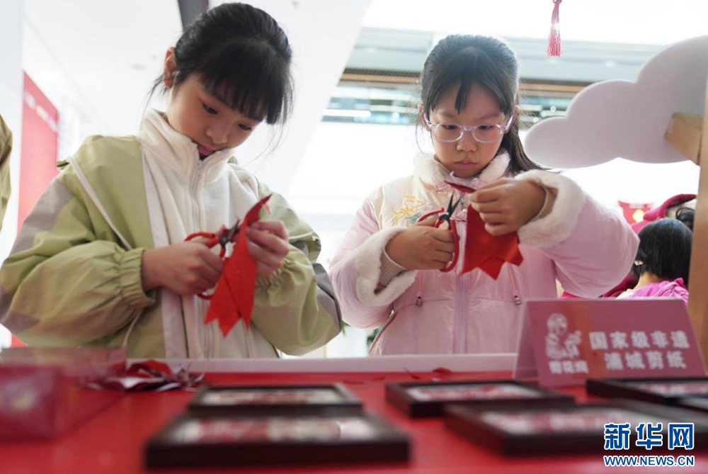 孩子们在活动现场体验国家级非遗浦城剪纸。新华网发(林晨 摄)