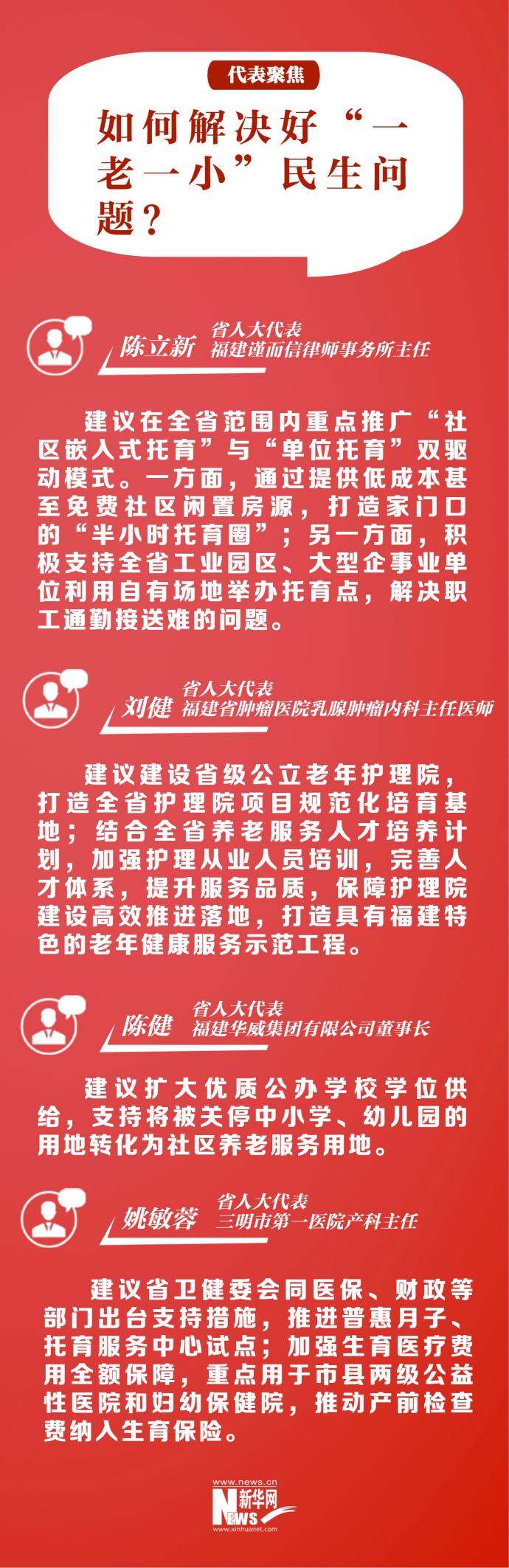 新华网福州1月30日电(刘丰)老有所养、幼有所育,关乎千家万户。今年福建省政府工作报告提出,要加强托育养老体系建设。福建省两会期间,“一老一小”民生问题再次成为省人大代表们牵挂的焦点。